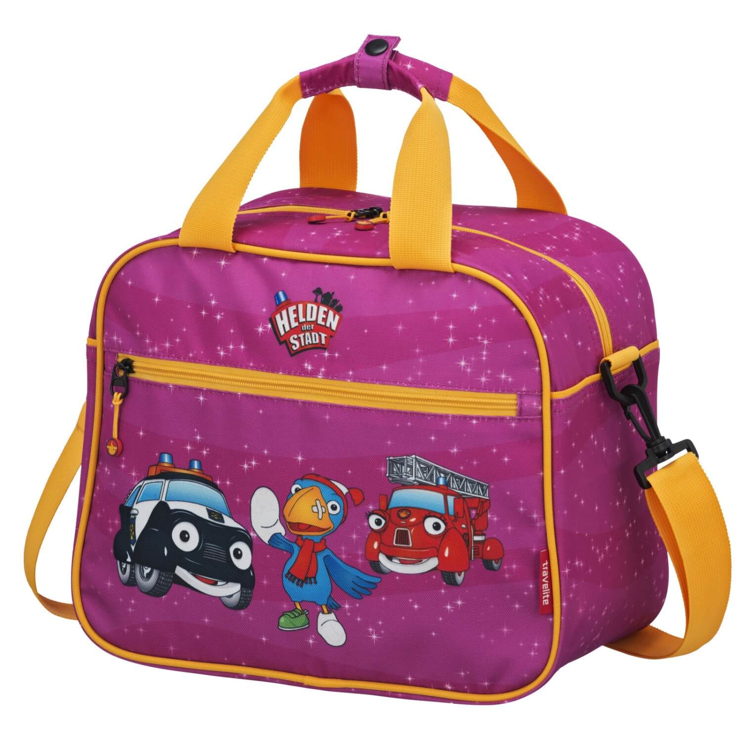 Torba podróżna TRAVELITE Bohaterowie Miasta należy do serii bagażów przeznaczonych dla najmłodszych podróżników. Wykonana została z wytrzymałego poliestru w kolorze różowym. Przednią stronę torby zdobią zabawne autka i papuga. Torba jest lekka i poręczna, spełnia wymogi bagażu podręcznego i może być wnoszona na pokład samolotu. Wewnątrz znajduje się pojemna komora główna zamykana na zamek, a na przodzie jest dodatkowa kieszeń zamykana na suwak. Zaletą torby jest możliwość zamocowania na stelażu walizki . Ponadto torba posiada wygodny podwójny uchwyt do ręki oraz regulowany, odpinany pasek na ramię.