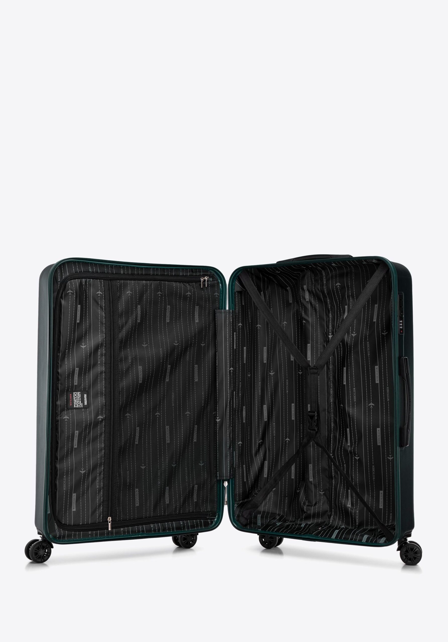 • Design: Nowoczesna estetyka z subtelnym tłoczeniem na powierzchni walizki, nadającym jej elegancki i unikalny wygląd.
